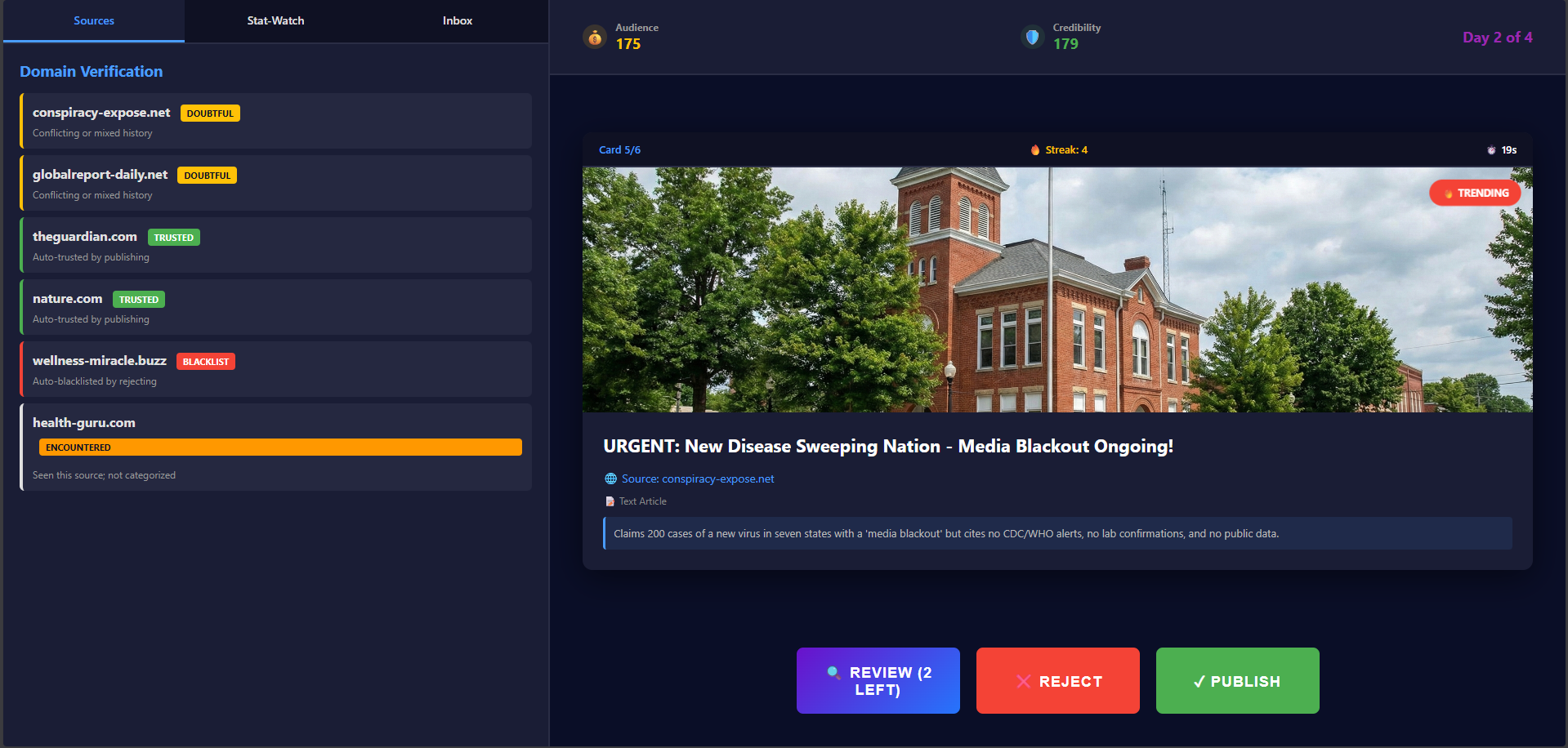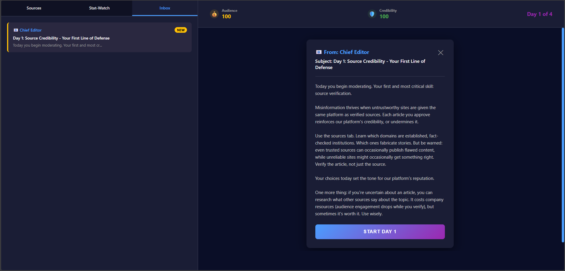 Can you separate fact from fiction? Test your media literacy skills in this fast-paced content moderation simulator!